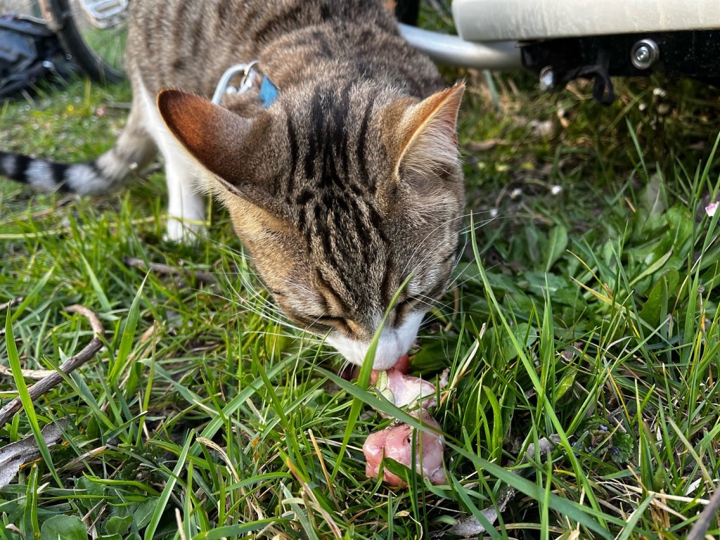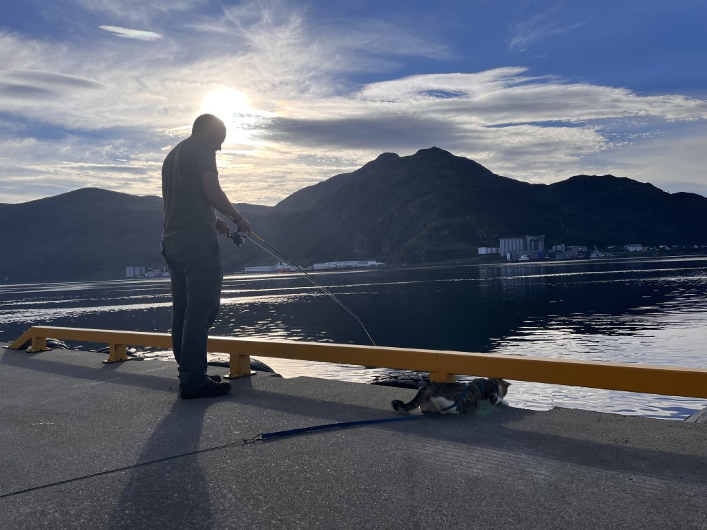 En Norvège, c’était très simple de complémenter Roro avec de la nourriture fraîche, car Alex pêchait tous les jours. Pédalant pendant 1 mois 1/2 dans les fjords, nous avons profité de l’abondance de poissons et plus précisement de maquereaux pour les repas. Rossell a donc régulièrement rempli son estomac de chair de maquereau, de brochet ou encore de perche. C’était dingue de voir la prise d’habitude et l’attraction que Rossell avait dès l’instant qu’Alex sortait son matériel de pêche. Roro se positionnait au pied d’Alex et le regardait sagement pêcher, ce qui mettait un pression à Alex car le petit félin refusait de se nourrir de nourriture industriel et n’attendait que la fin de cuisson de son poisson.