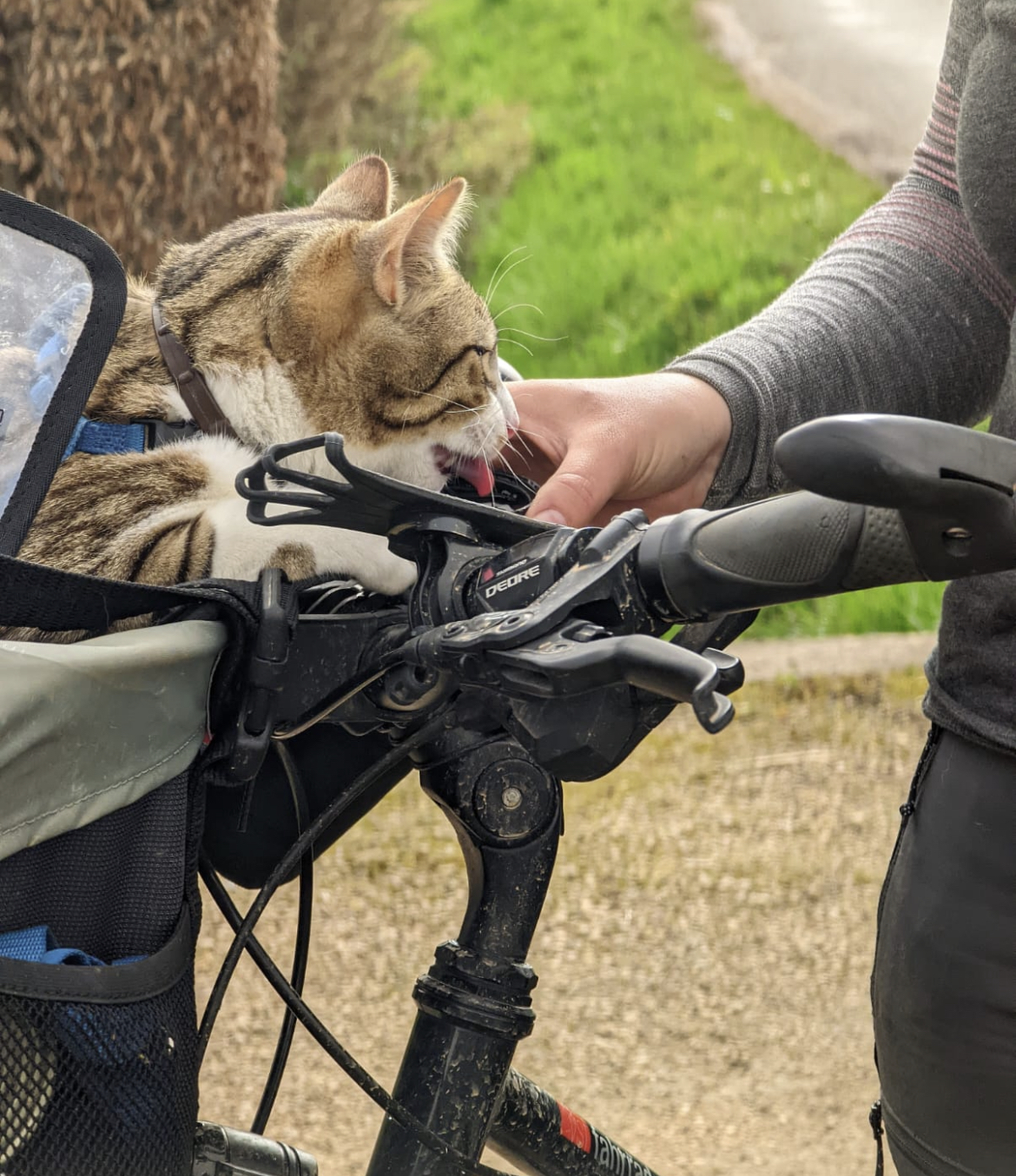 Cette petite boite est placé dans un filet à l’extérieur du panier de transport de Rossell, ce qui me permet de lui proposer régulièrement de la nourriture et de lui donner s’il vient à la réclamer pendant les moment de pédalage.