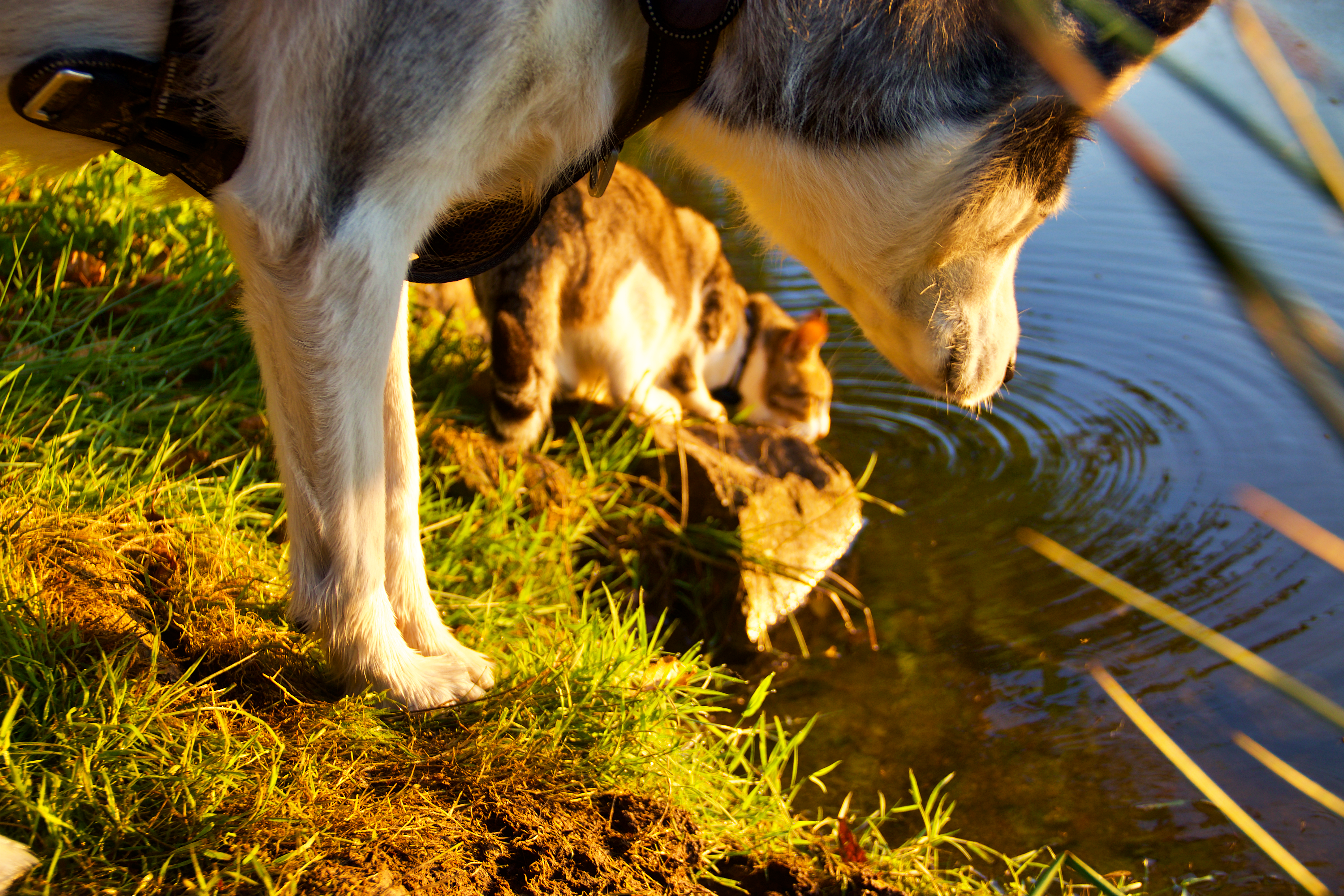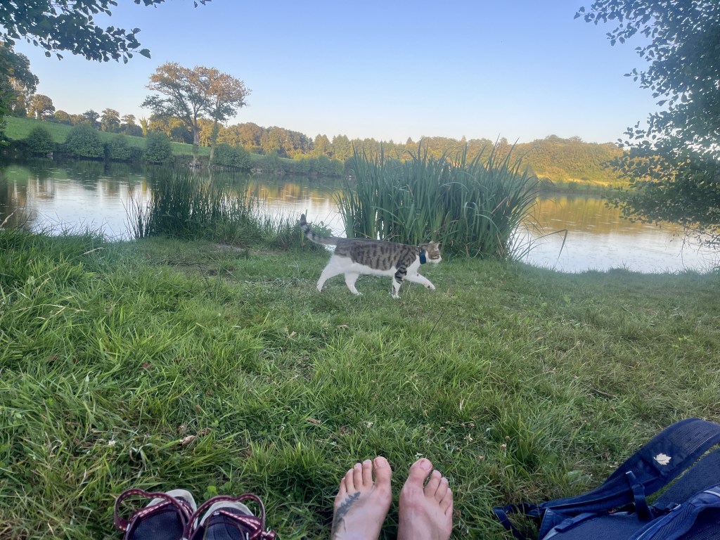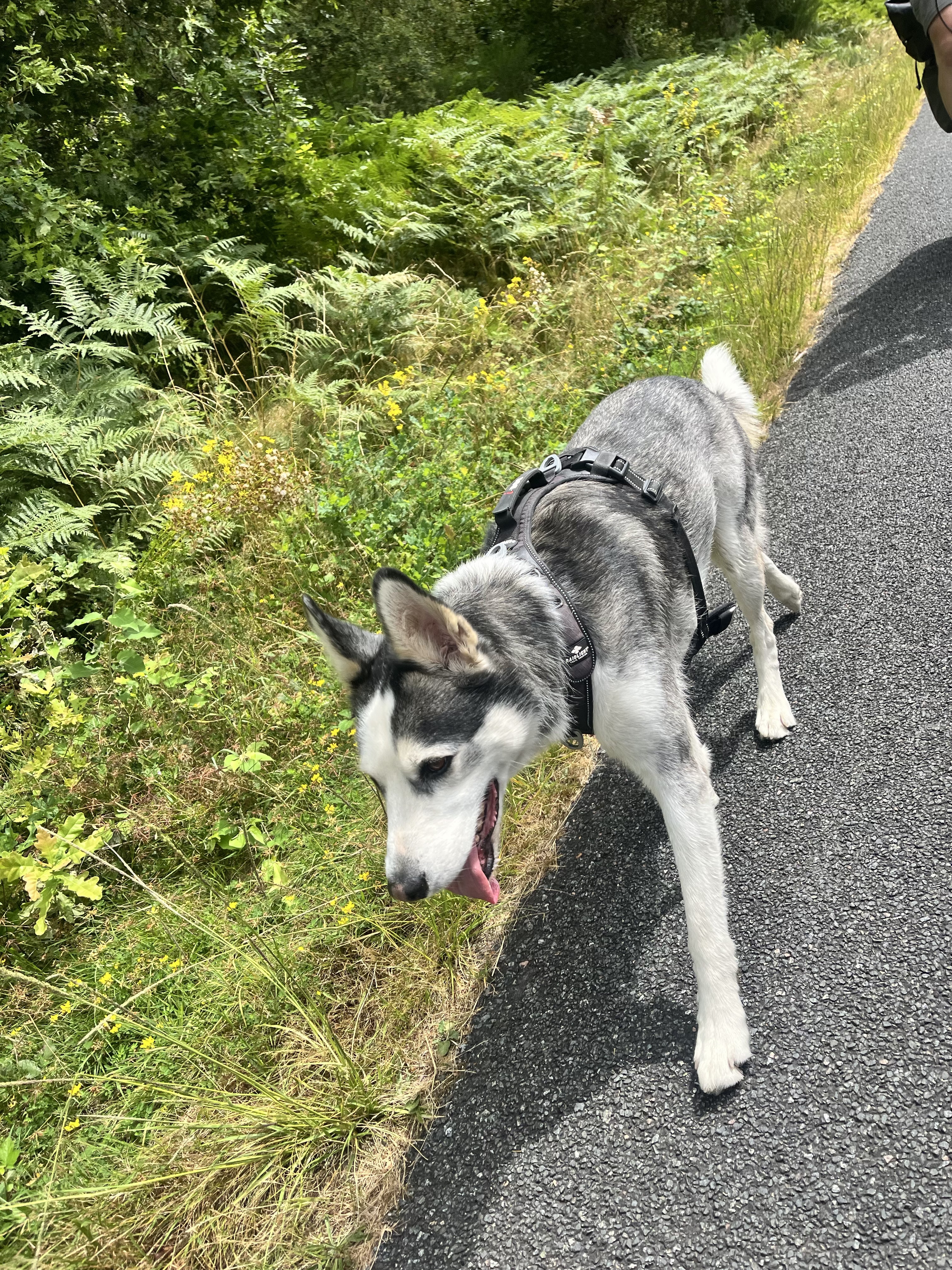 Mallo met ses chaussures pour protéger ses pattes de la chaleur du goudron lors des montées. Nous avançons avec soin, veillant au confort des animaux, mais bientôt, Rossell manifeste son mécontentement par des miaulements insistants. Dans ces instants, il est crucial de réfléchir vite et bien pour minimiser leur inconfort. À seulement trois kilomètres du but, nous nous accordons des pauses à l’ombre tous les kilomètres, jusqu’à ce que le splendide lac de Vassivière s’offre à notre vue.