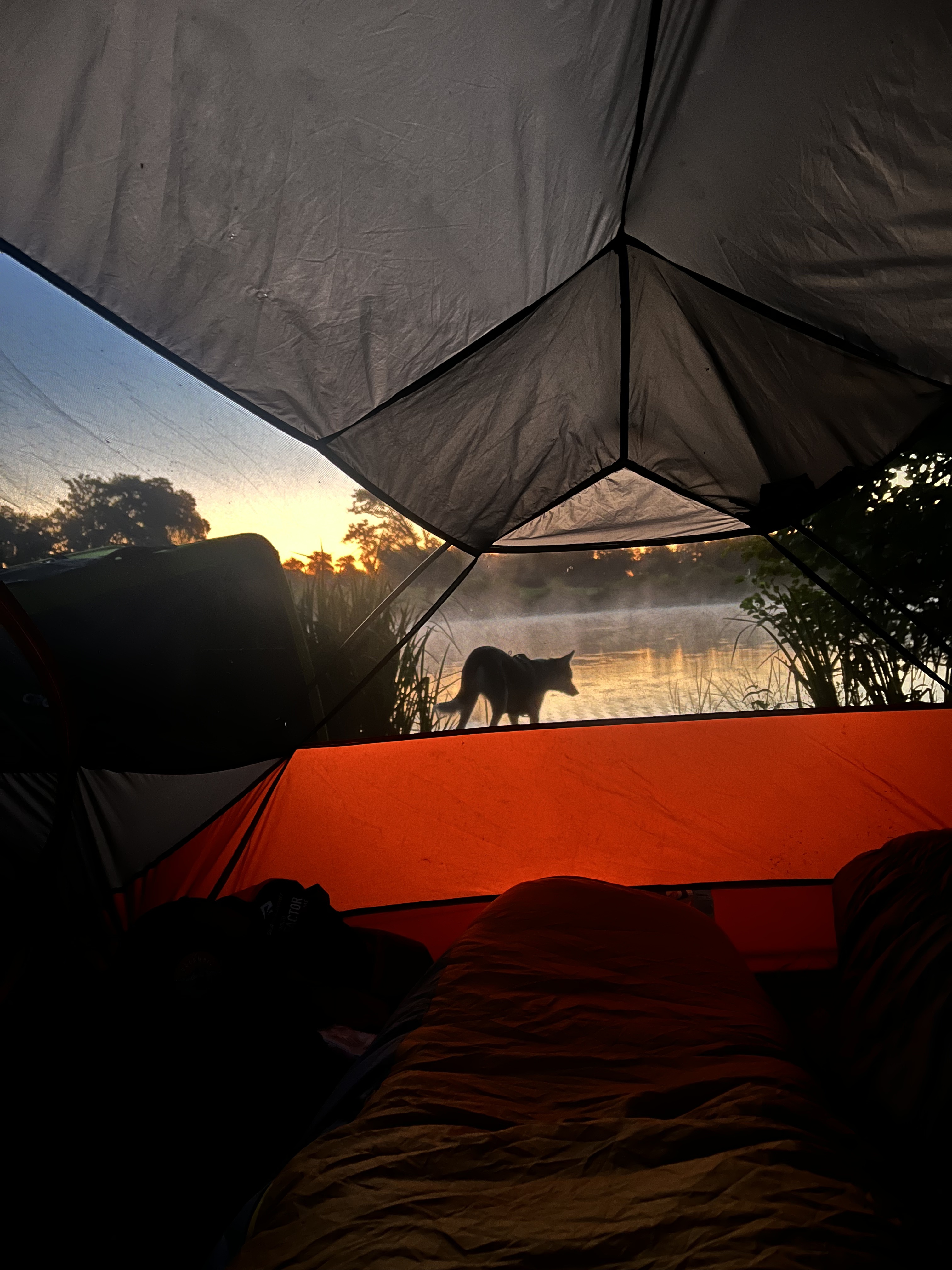 Nous avions demandé aux animaux de patienter un peu, avant de trouver un magnifique spot en bord de la Creuse. Le coucher de soleil colorait le paysage et la rivière juste au pied de notre tente, offrant un cadre parfait pour une baignade.