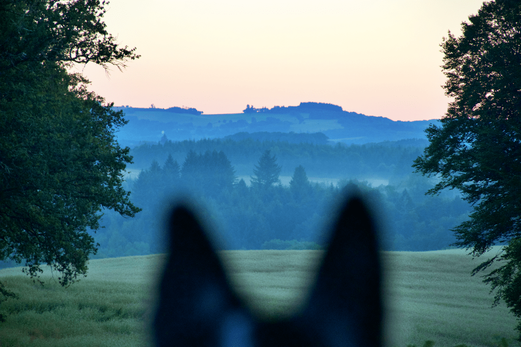 La douceur de notre réveil entre champs, forêt et fougères est agréable. Les vélos sont parés à reprendre la route et j’appelle les animaux à rejoindrent leur poste respectif. Après ses deux nuits de libertés, Rossell a déjà repris le rythme du voyage. C’est vraiment super de voir la rapidité à laquelle il reprend cette routine.