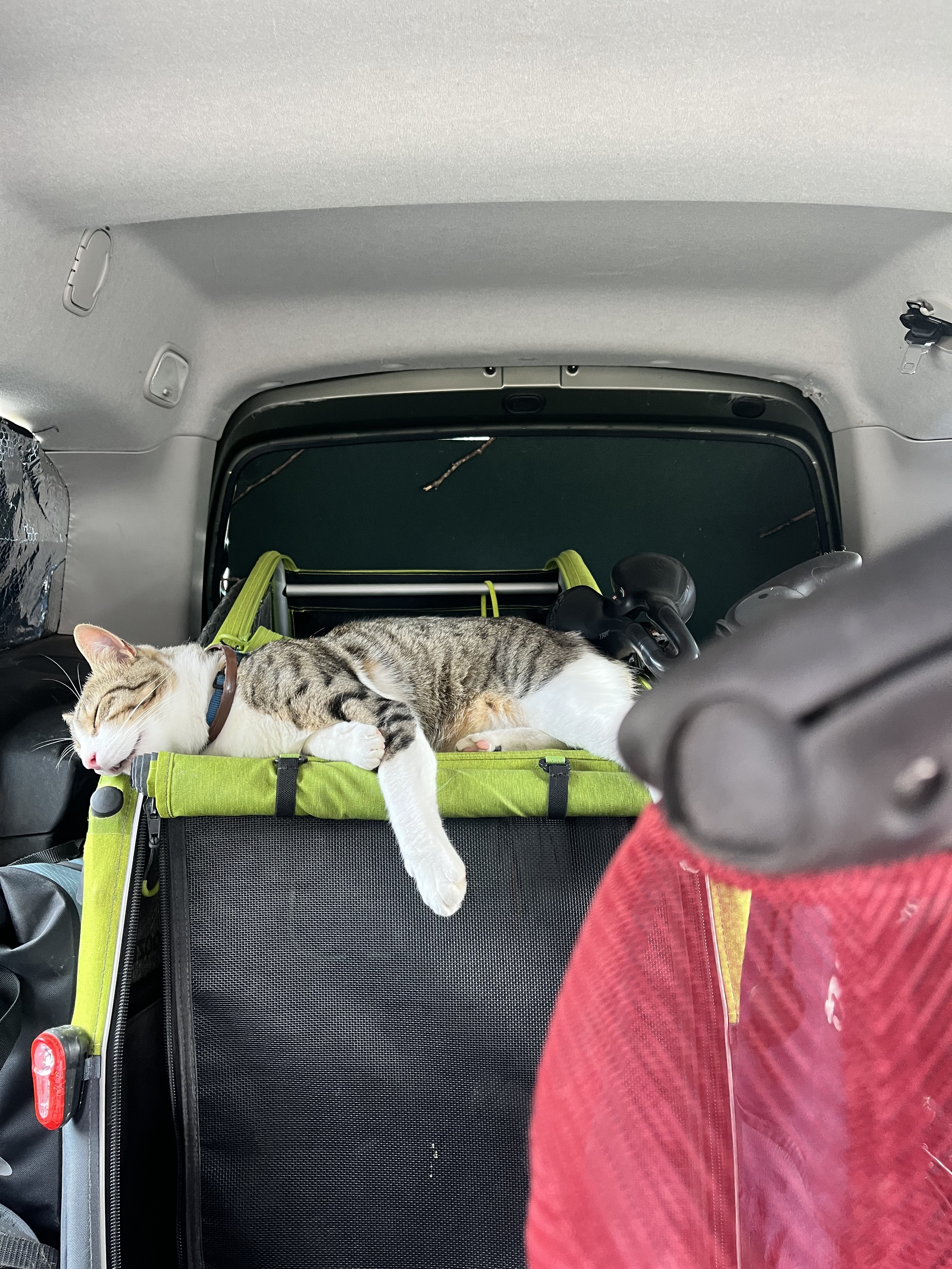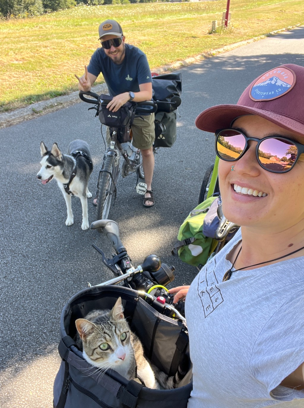 Une montée pour activer le cardio, puis une descente pour savourer la vue, le chat s’éclatant dans son panier. Les sourires figés sur nos visages, les vacances étaient officiellement lancées !