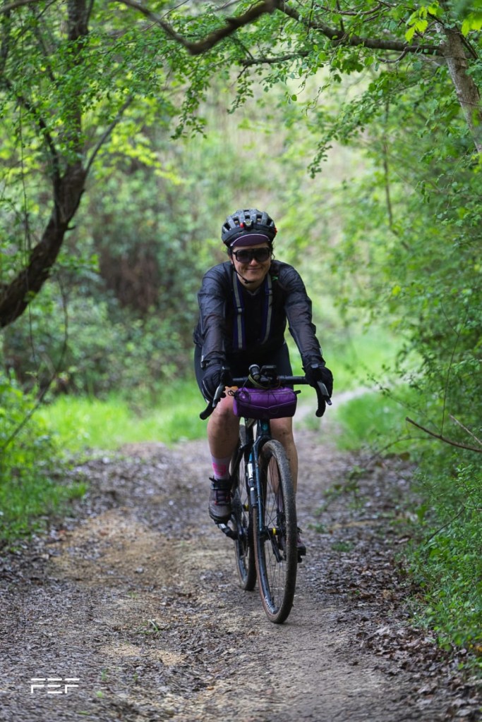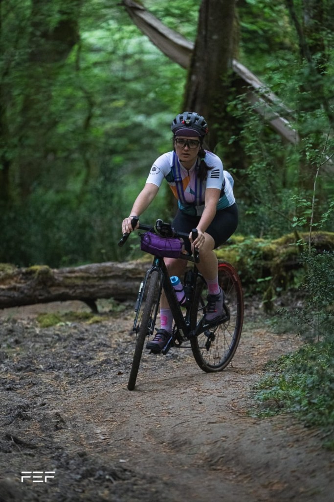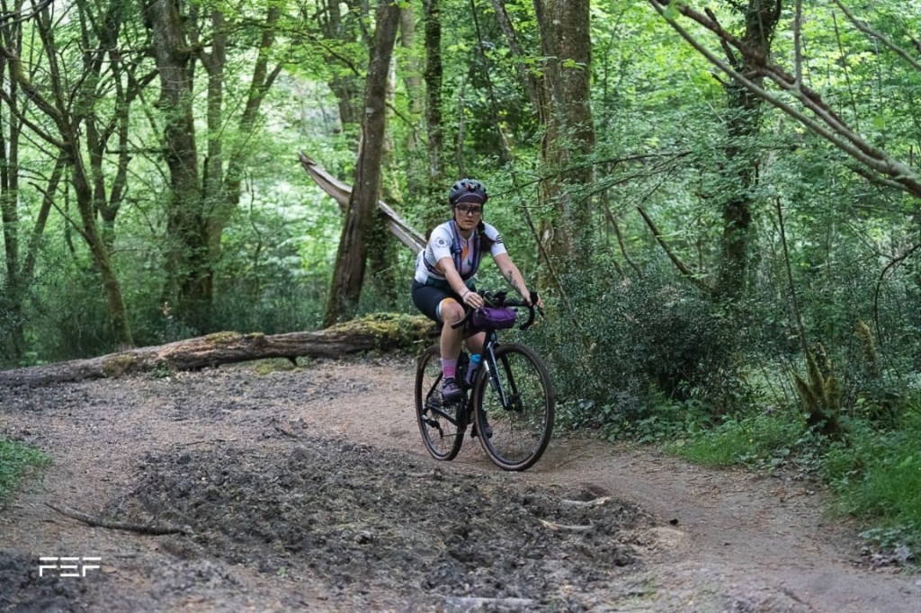 Premier obstacle : il faut porter le vélo pour passer un portail. Le deuxième portail arrive rapidement. Nous enchaînons sur une montée en forêt, et les désaccords de GPS commencent à se faire entendre. Je suis seule (de toute façon nous ne sommes que deux nanas sur cette connerie ; les quelques autres sont non-partantes) et je sens qu’il faut que je fasse une pause car j’ai la sensation de perdre l’équilibre. Je croise les photographes, je suis contente car j’aurai au moins un souvenir de cette folle journée. En sortie de la forêt je tombe sur Alex qui m’encourage ; j’ai juste envie de lui faire un câlin et de dormir dans ses bras, là.