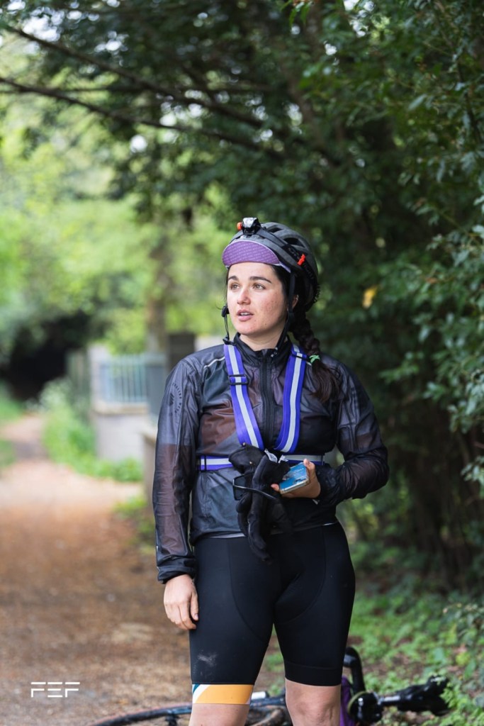 Bon, au passage d’Alex je n’avais pédalé que 15 km. Je ressens de nouvelles sensations que je ne connaissais pas encore auparavant : celle de faire un/des malaise(s). J’ai la tête qui tourne dès que j’ai le malheur de m’arrêter. Je n’arrive toujours pas à m’hydrater, à manger et donc à enclencher les moteurs. Je croise de nouveau les photographes (décidément) et ils m’encouragent en me disant que je suis la première femme (ouais… nous sommes deux les gars). Je peine à avancer, je trouve les tours de pédale extrêmement durs à donner. Je regarde mon compteur et je suis à 29 km, le coup de massue. Je regarde mon téléphone et je vois un message de l’autre participante s’excusant parce qu’elle abandonne. Je ne sais pas quoi faire, mais je dois m’asseoir car mes jambes ne me tiennent plus. Je suis bien assise là, par terre dans la boue et le froid. J’ai envie de dormir. Des participants passent devant moi et me demandent si ça va (un groupe de trois personnes en VTT électrique sur la trace 120 km). Je leur explique que ma nuit a été compliquée et lorsqu’un des hommes entend que je suis un peu malade, il fait un bond en arrière et protège sa femme… de qui ? de moi ? J’ai l’impression d’avoir la lèpre ou de devenir un zombie. 🧟♀️ Je suis HS mais je capte que son comportement n’est pas cool. La femme fait un peu de social avec moi et reste bienveillante, jusqu’à ce qu’elle me dise « fait gaffe si tu rentres à Bordeaux solo, il y a une nana qui a eu un accident à cause d’une voiture qui l’a percutée »… Oh bah super.
