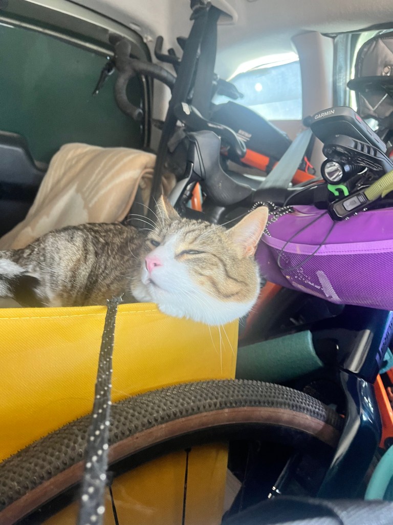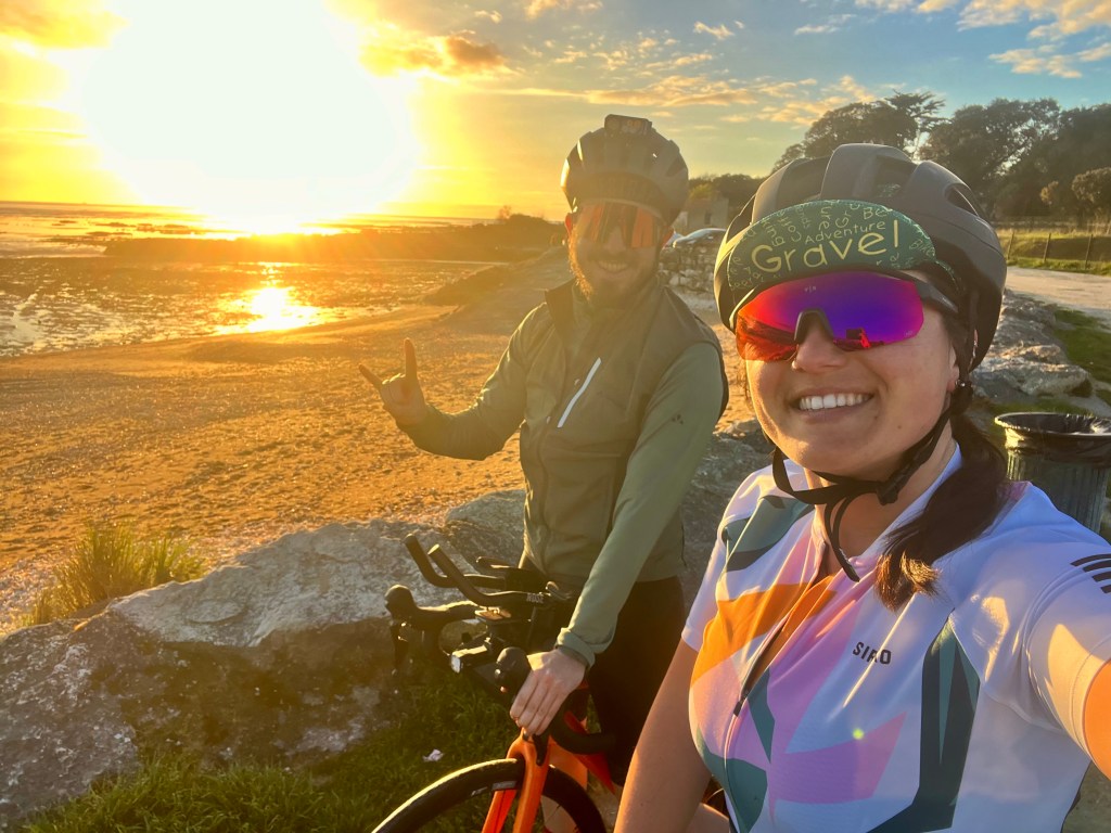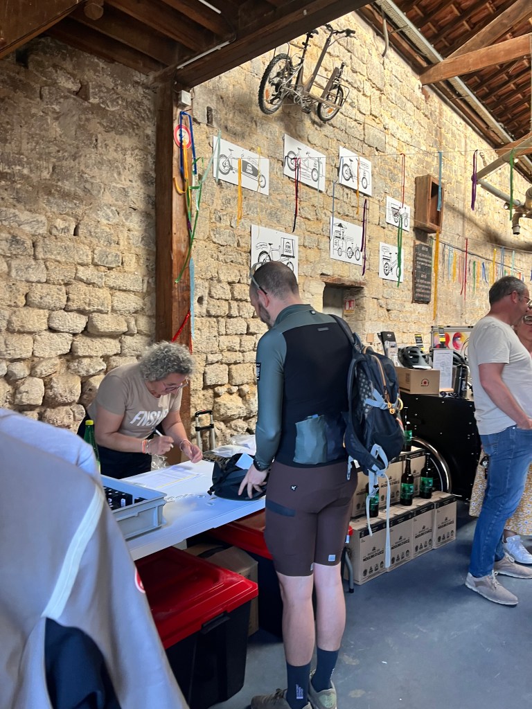 Une fois de retour au lit, je m’effondre. Je reçois des messages très touchants d’amis remplis de sagesse qui pratiquent le vélo et/ou la compétition ; ça me fait du bien. Puis nous retournons sur le lieu de rendez-vous de l’événement et la team GravelMan est là. Nous sommes le couple malade qui a abandonné, mais qui traîne pour « profiter » (en sécurité) de l’ambiance. Merci à Steven, Micka et la team pour cette orga et cette bienveillance. C’était de nouveau un plaisir de les croiser et de discuter avec eux.