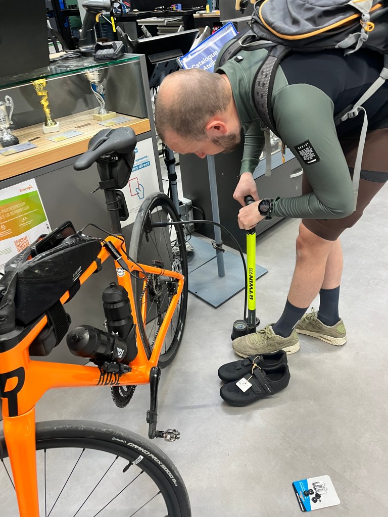 👉Lorsqu’Alex s’est rendu expressément au Décathlon le plus proche pour acheter une paire de chaussures et de quoi réparer son pneu à 5 min de la fermeture… il a acheté une paire de chaussures de route + cales SPD (mauvaise association).